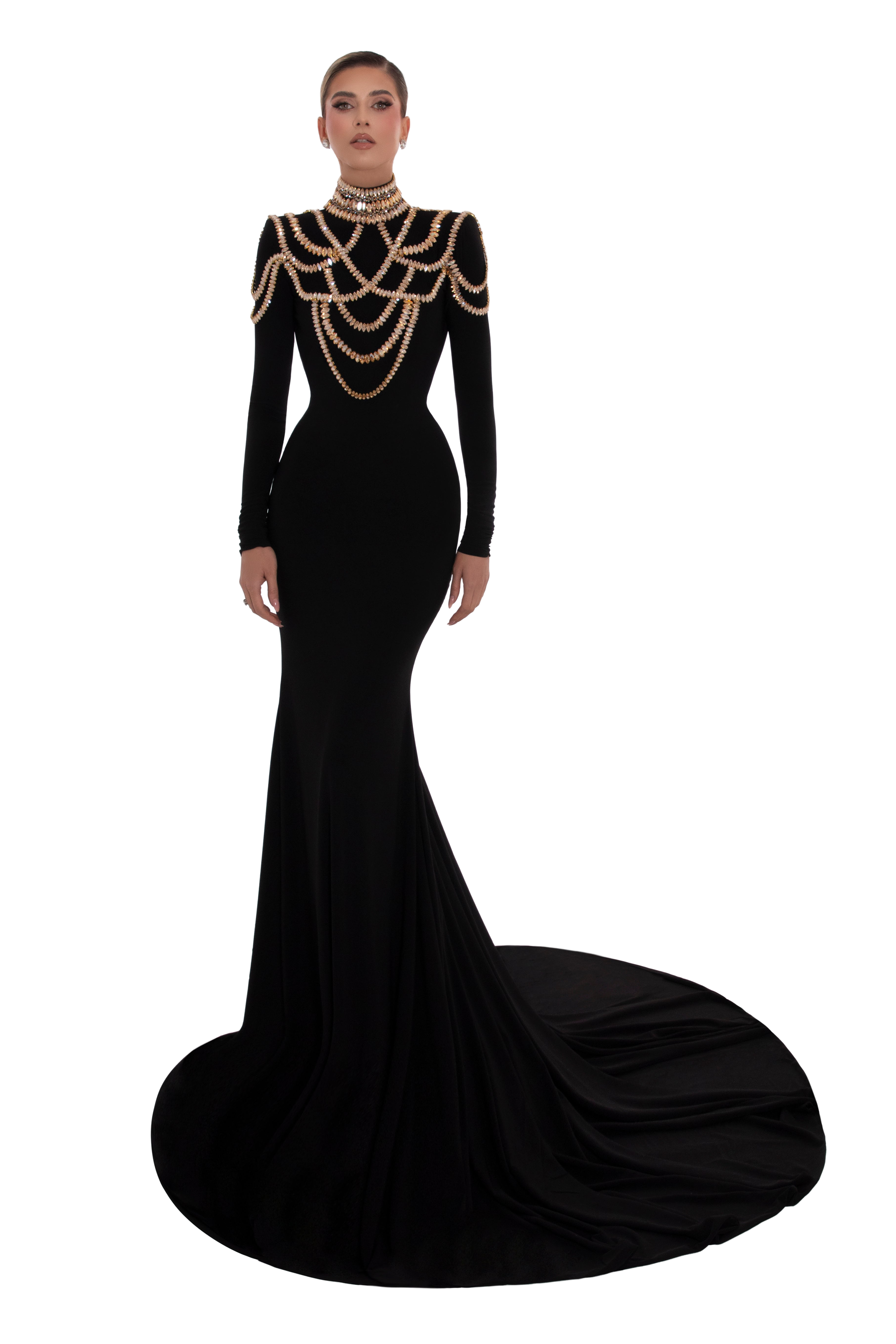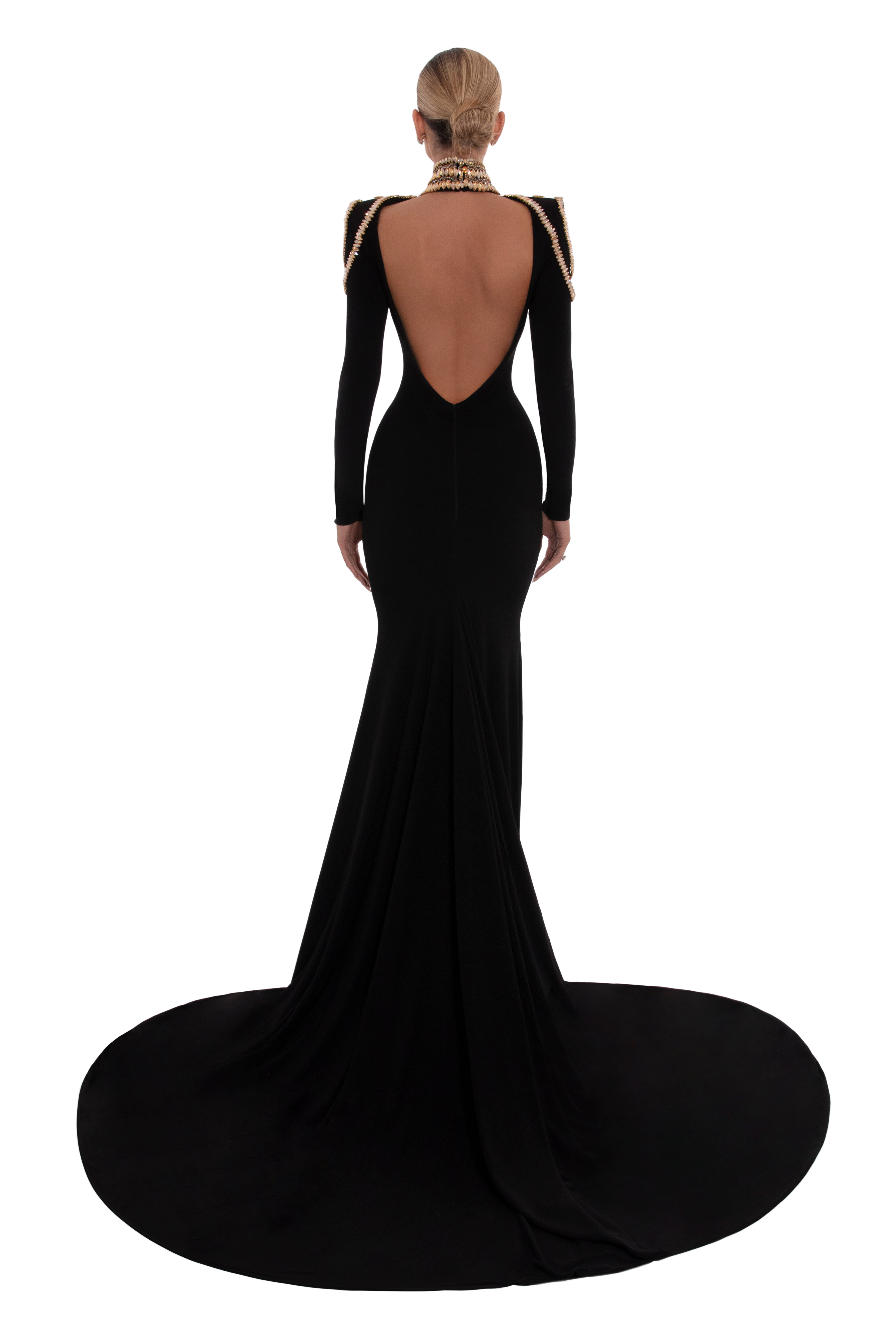 Long SleevesHigh-Neck With Jewel NecklineBackless Stone DesignLong TailConcealed Back ZipperBlack Color