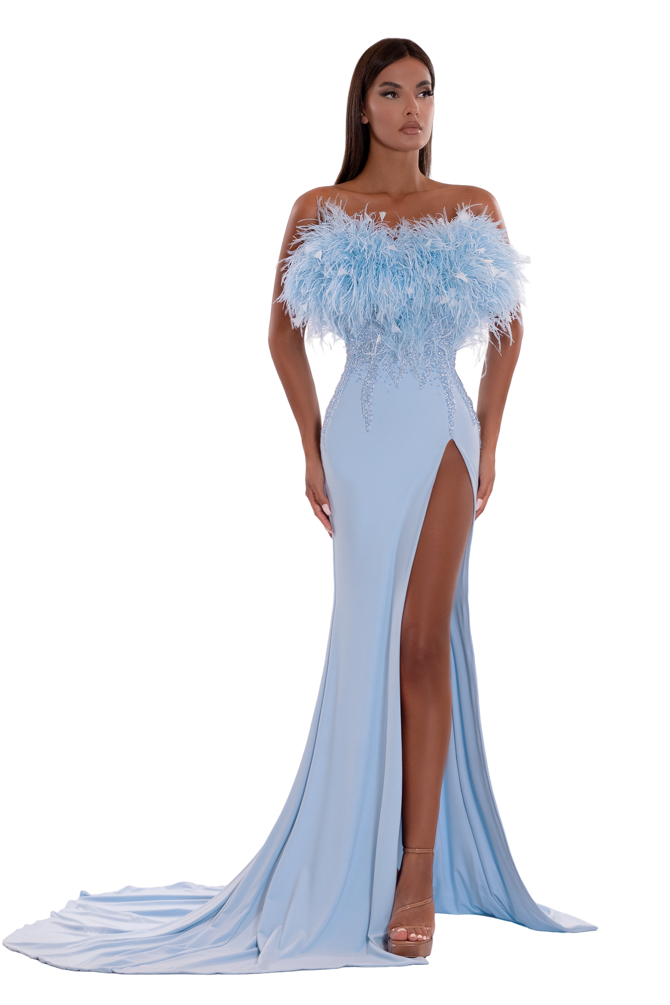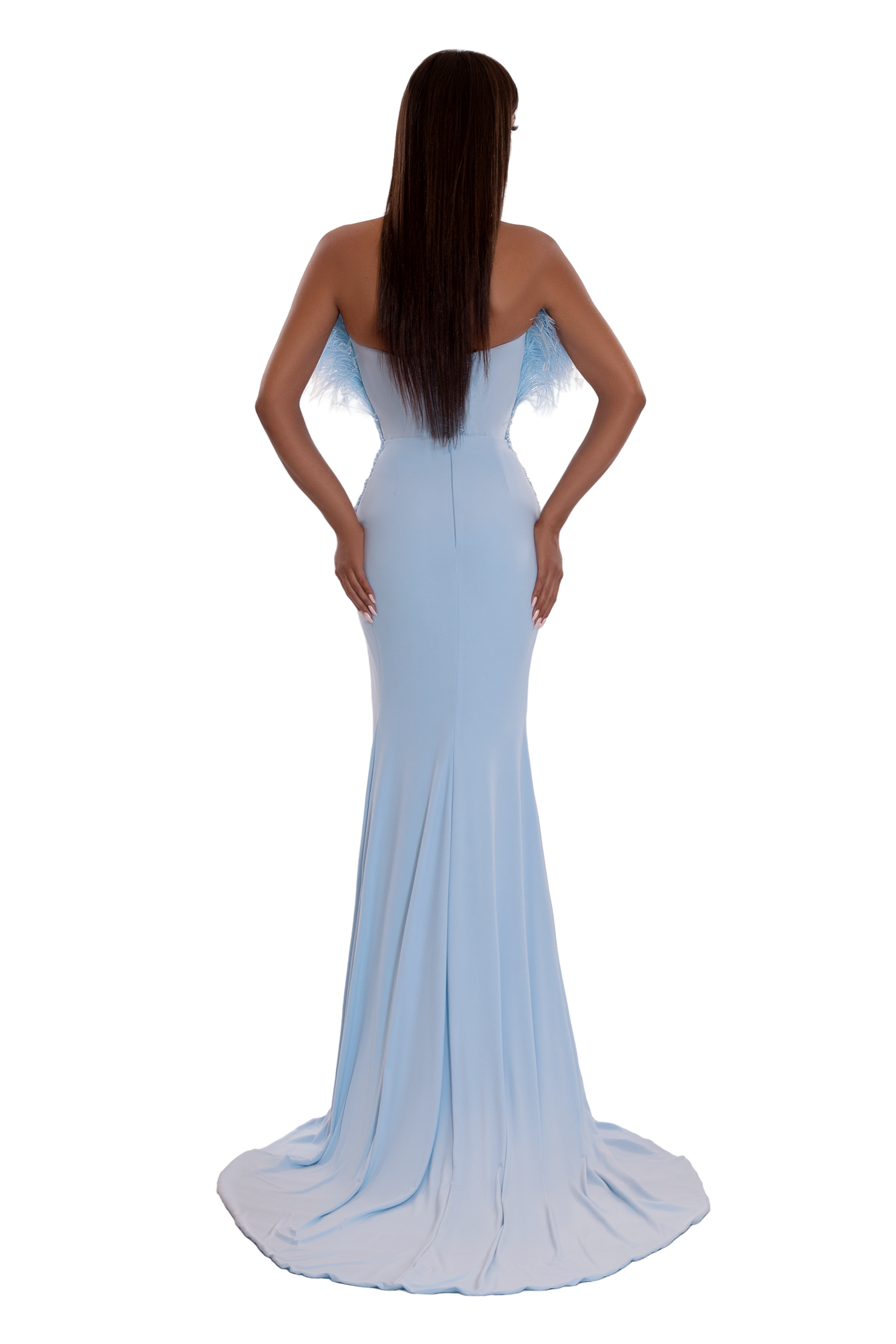 THE UPPER PART OF THE DRESS HAS CORSET WITH FEATHERS.