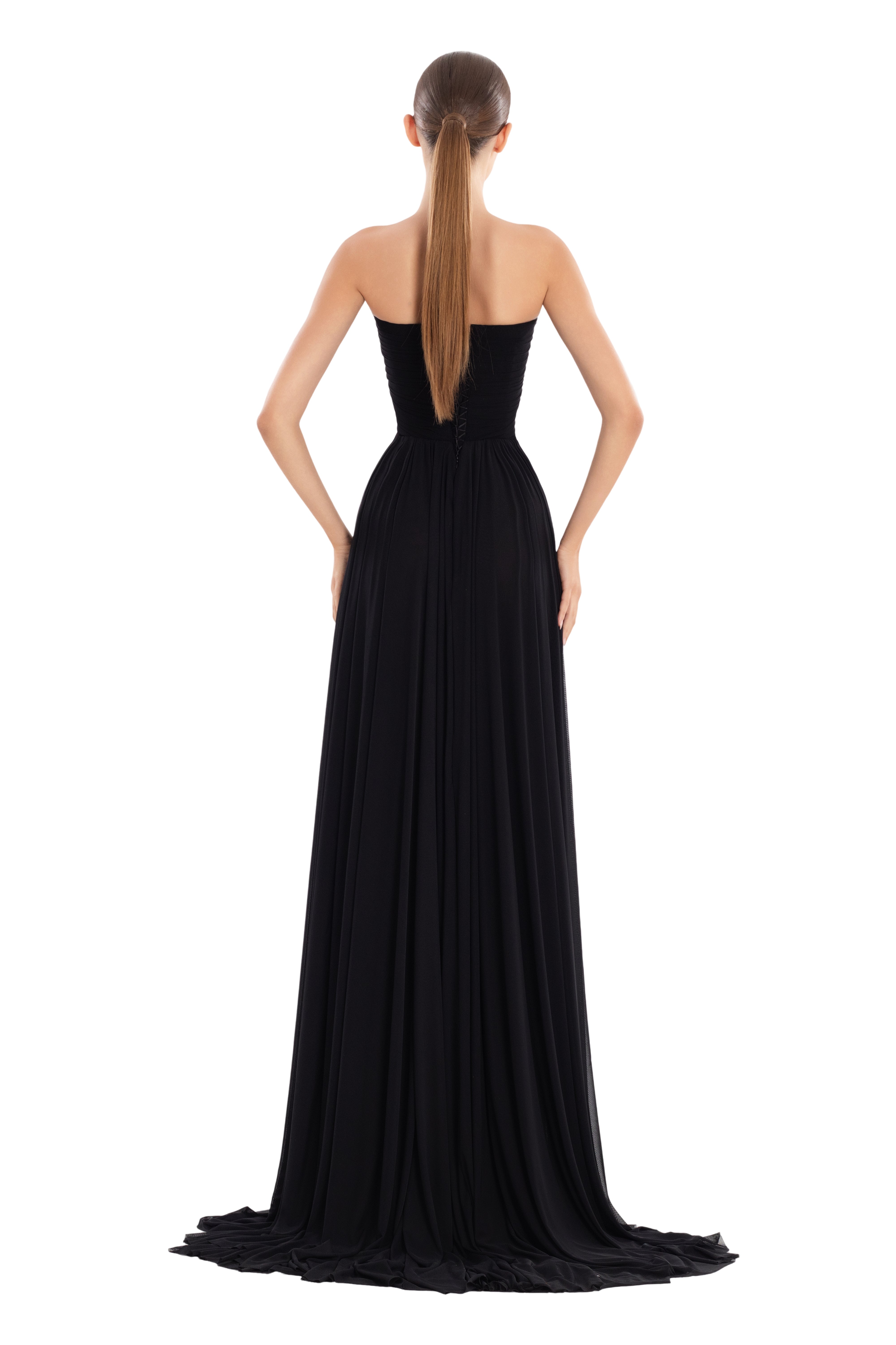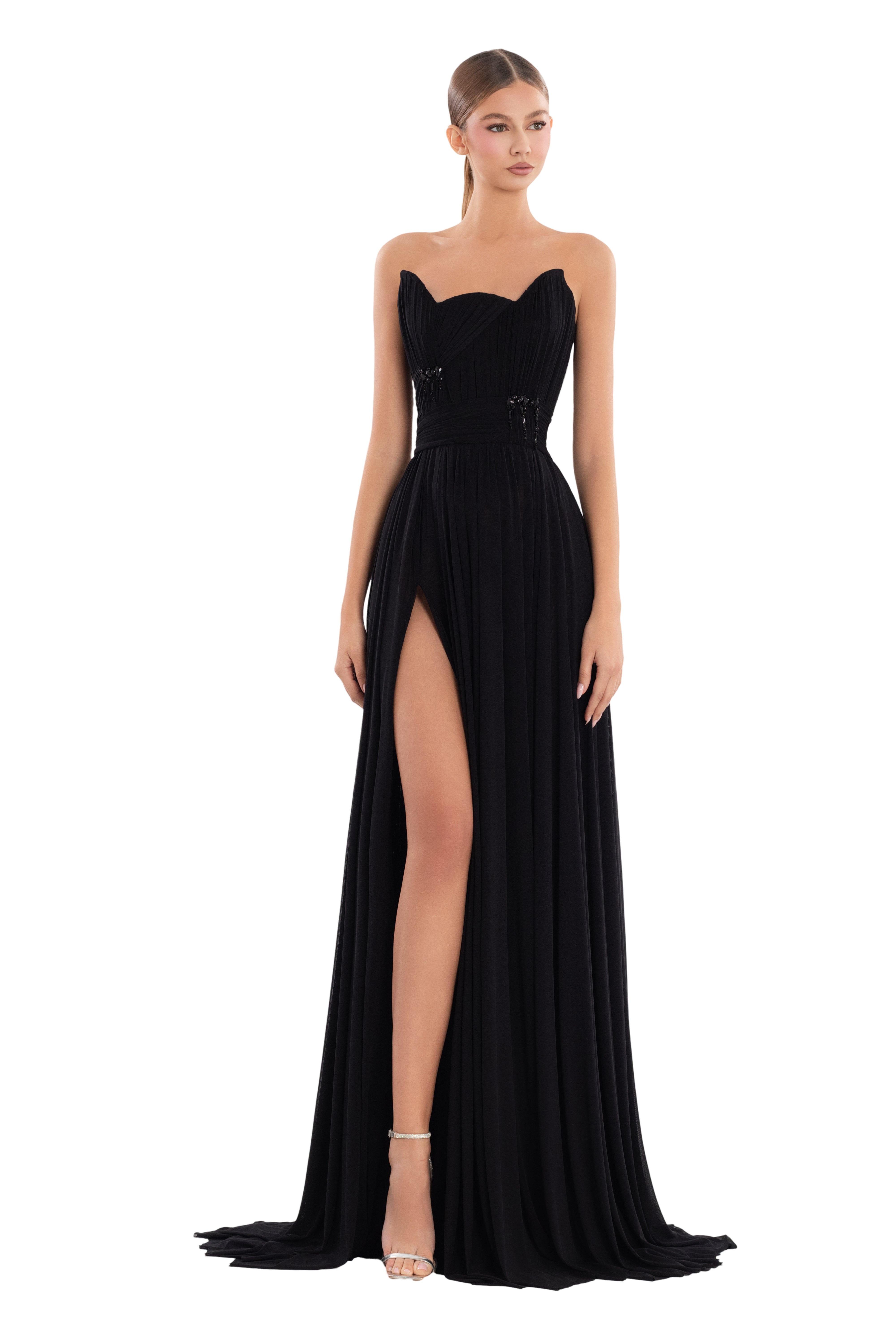 Strapless sweetheart neckline with ruched detailing for a romantic touch
