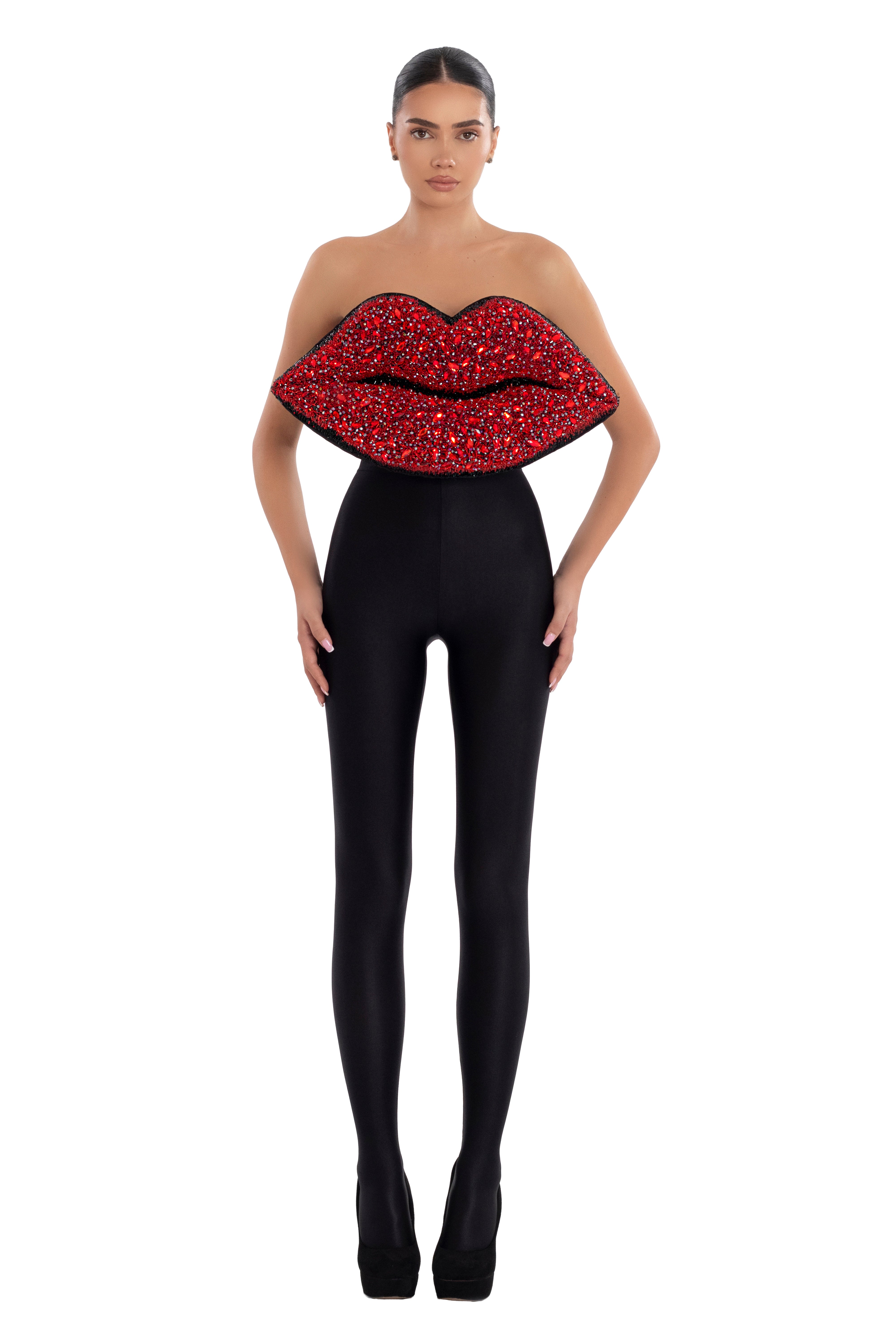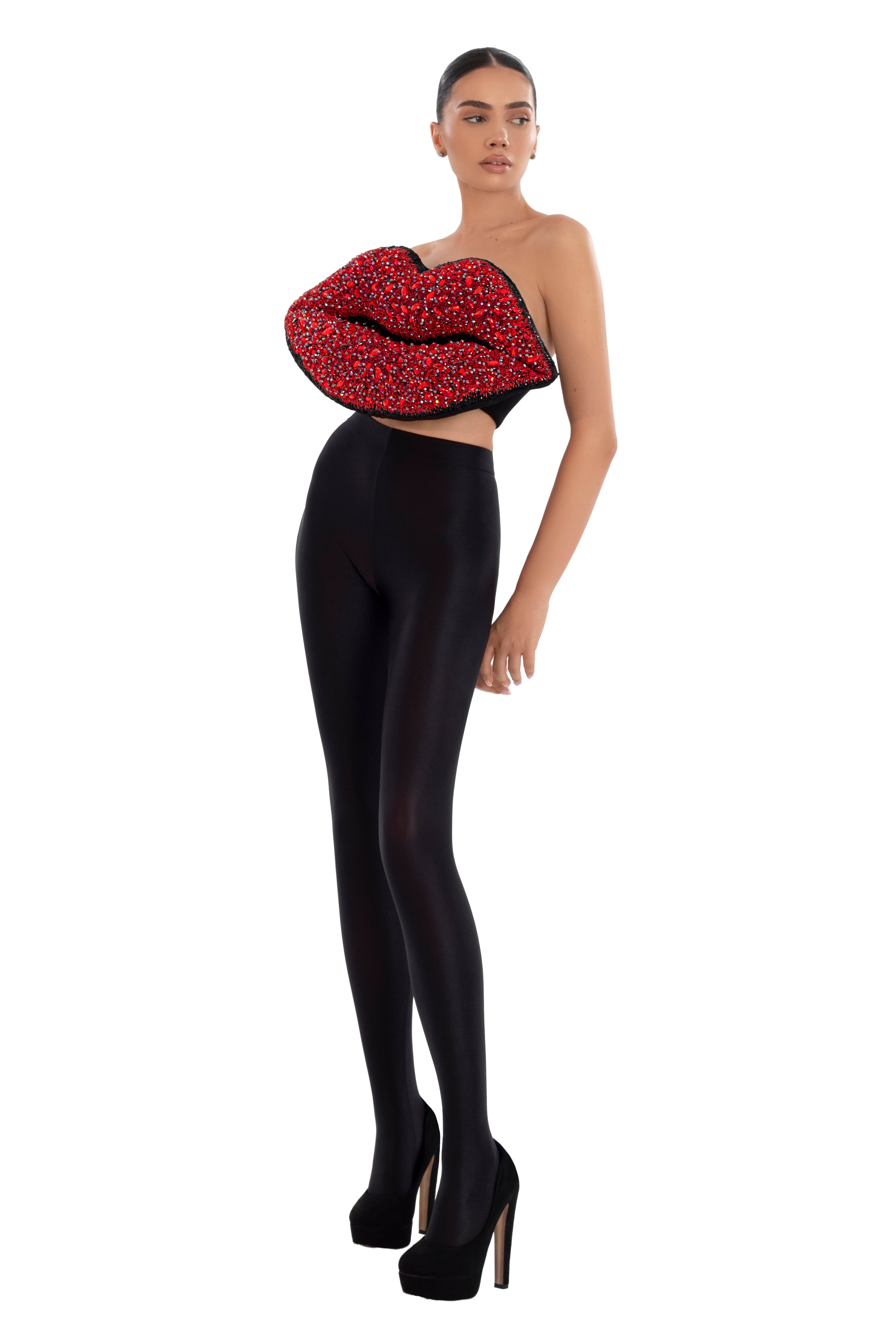 Handmade corset adorned with a striking red lips design, detailed with sparkling stones and crystals. Combined with sleek black leggings, this look is perfect for making a dramatic fashion statement.