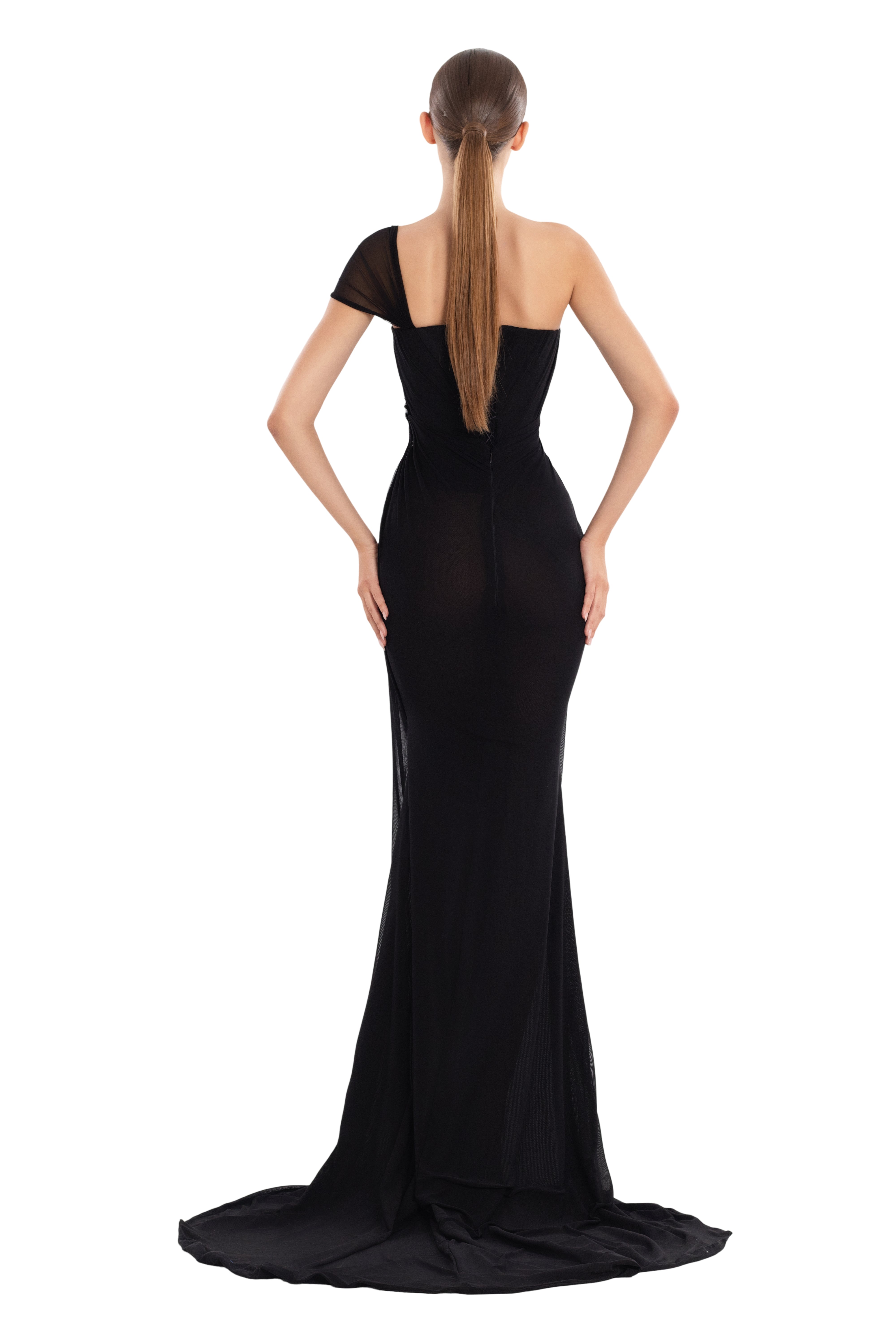 This captivating gown features a one-shoulder design with an asymmetrical drape for a modern and chic look