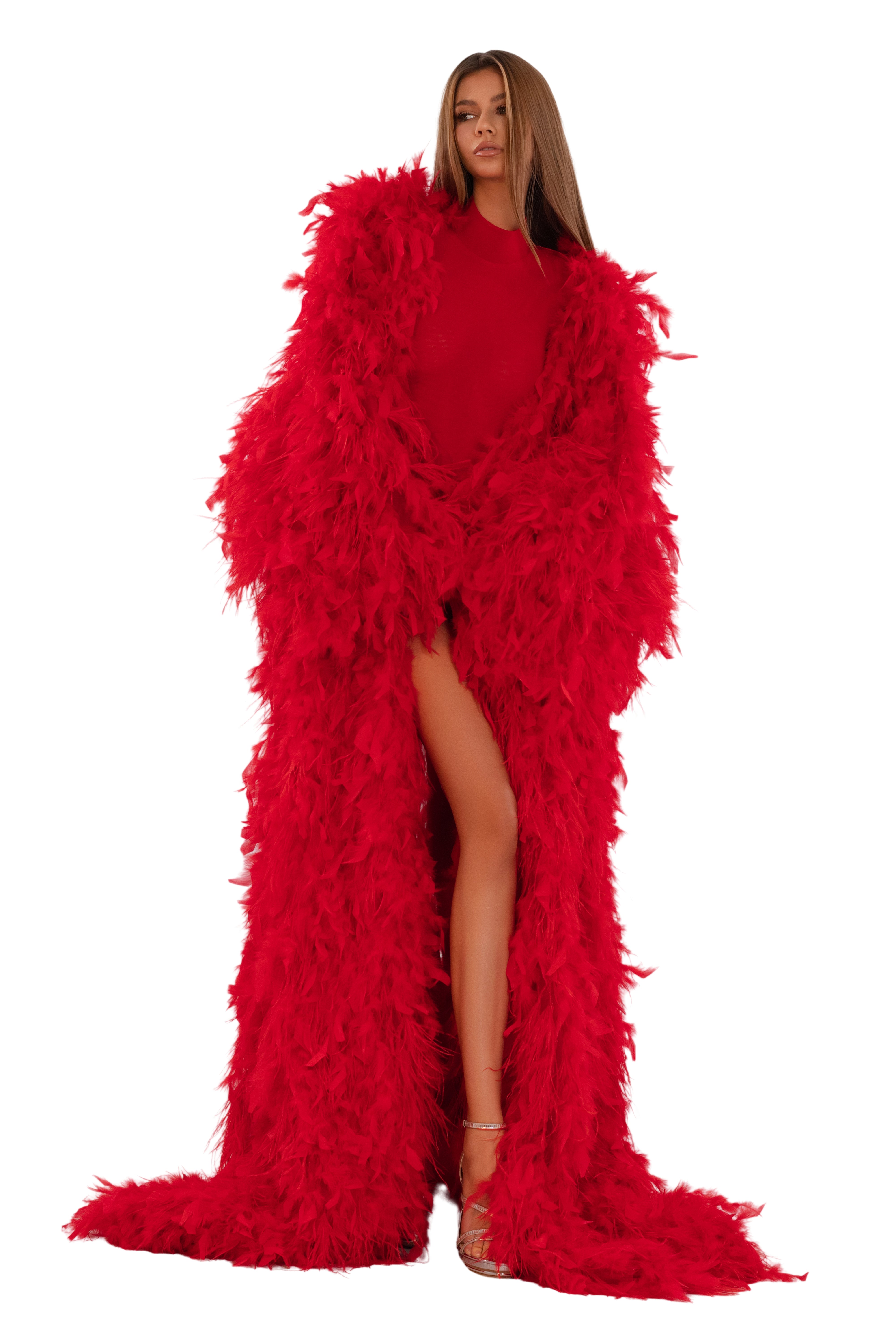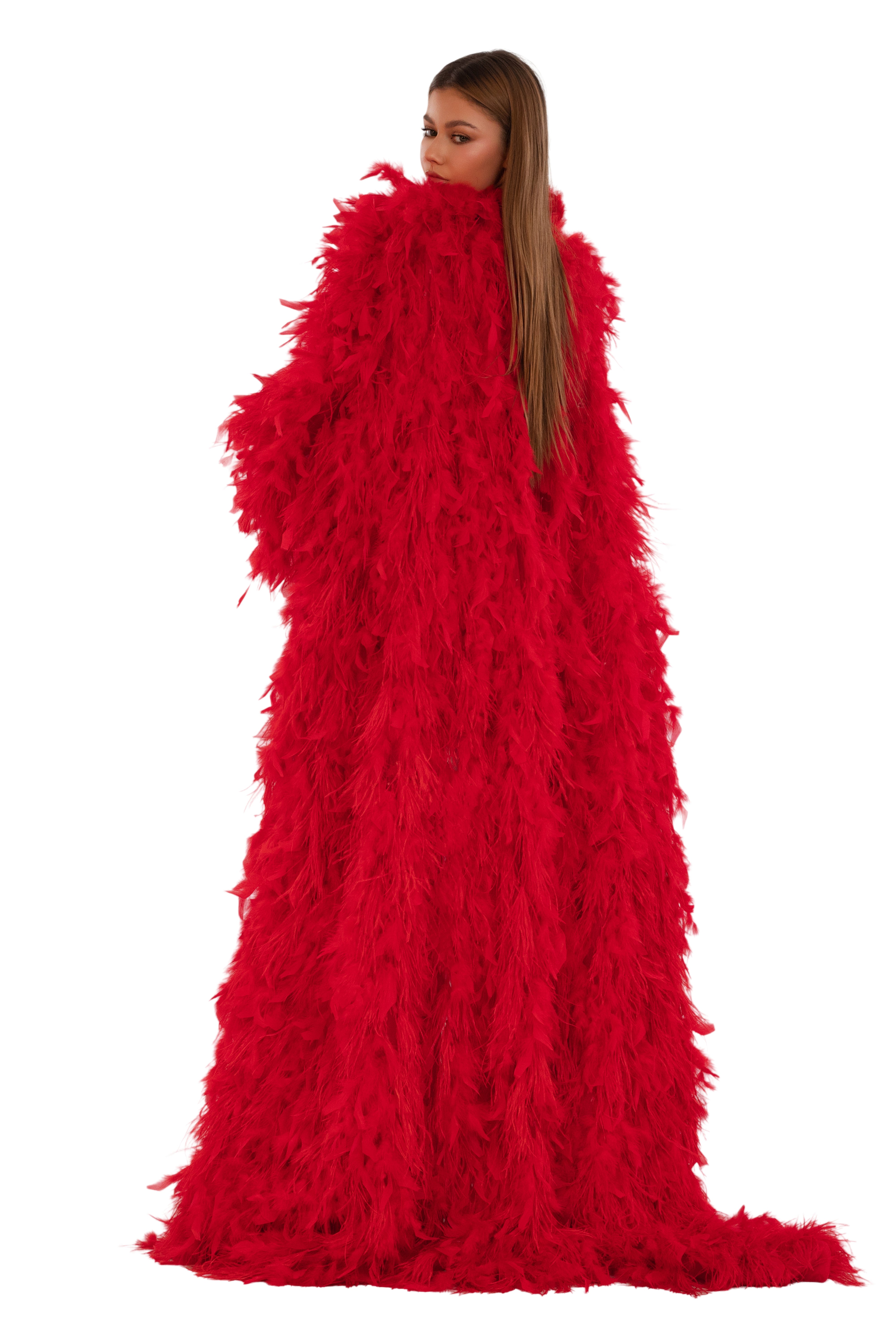 Luxurious full-length coat adorned with vibrant feather accents
