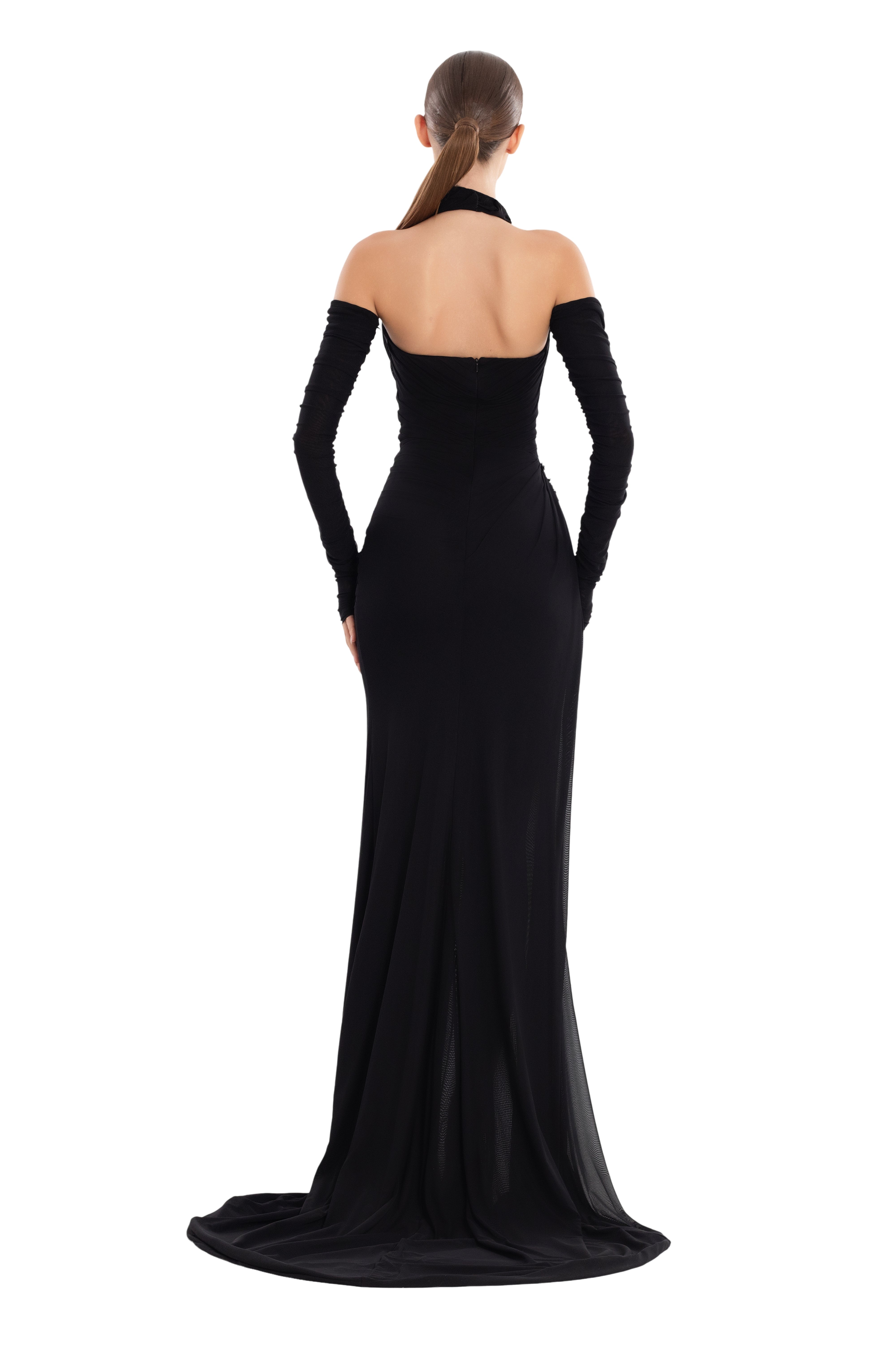 High-neck halter-style evening gown with a sophisticated design